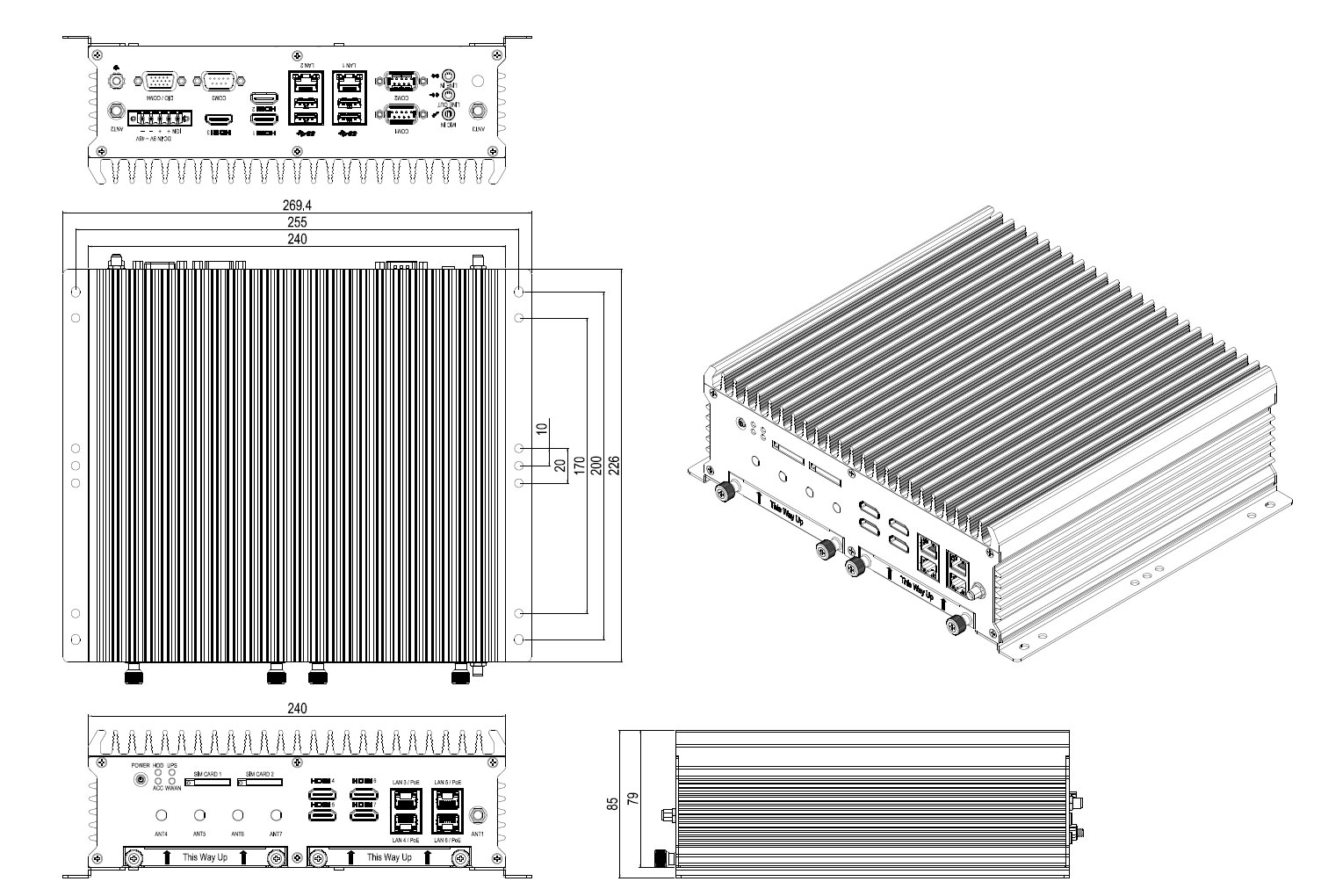 3x RS232/422/485, 4x digital In/Out and 4xUSB3.0 allow maximum connectivity. 7x HDMI connectors allow the connection of a variety of displays. The integrated graphics unit supports DirectX12, OpenGL4.5 and OpenCL1.2.